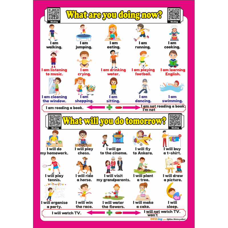 Etiketler: ilkokul, ingilizce, poster, what are you doing, present continuous tense, şimdiki zaman, what will you do tomorrow, gelecek zaman, future tense, poster, afiş